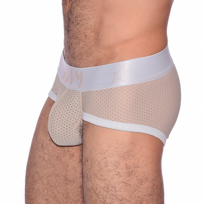 Si eres mas arriesgado este brief de malla color beige y elásticos y sesgos blanco es para ti. Este interior cuenta con una copa con realce delantero, que hará que todo este en su sitio y se vea como siempre has querido, ademas cuenta con una abertura superior funcional. Úsalo y te hará lucir seguro y muy cómodo.
