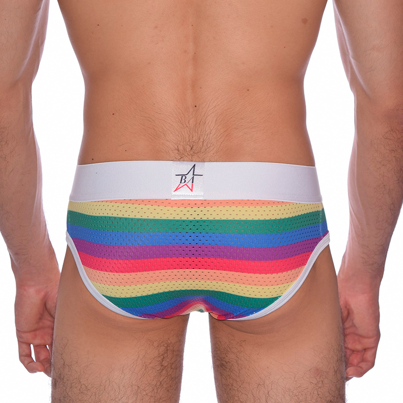 Si eres mas arriesgado este brief de malla de rayas de la bandera pride y elásticos y sesgos azul blanco es para ti. Este interior cuenta con una copa con realce delantero, que hará que todo este en su sitio y se vea como siempre has querido, ademas cuenta con una abertura superior funcional. Úsalo y te hará lucir seguro y muy cómodo.