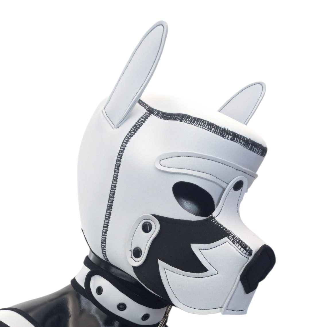 Máscara de perro inspirada en anime para hombres en color Blanco y bordes negros. Diseño de personaje juguetón y sexy ideal para cosplay, creación de contenido erotico. Ajuste cómodo, el hocico de la mascara se puede remover para dejar la nariz y la boca libre.